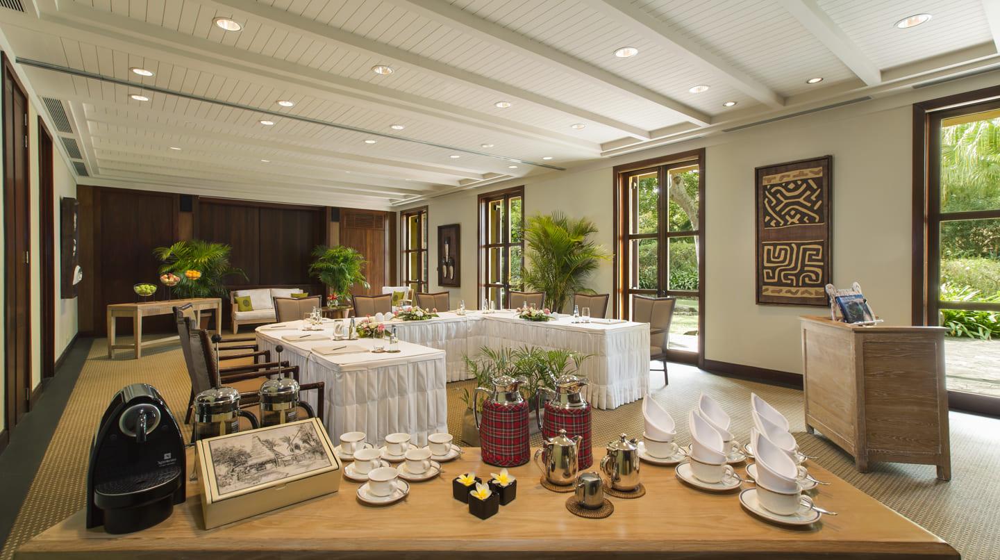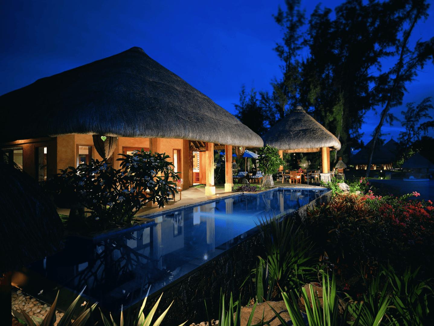 - Ресторан: The Restaurant – с великолепным видом на океан естественно освещенный в дневное время, ночью этот изысканный ресторан приобретает новые оттенки. Воды бассейна отражают огни пылающих факелов, а на другом берегу океана можно наблюдать мерцающие переливы гавани Порт-Луи. Отведайте настоящую креольскую, интернациональную и индийскую кухню "а ла карт" в традиционном зале с соломенной крышей или на свежем воздухе под звездным небом.