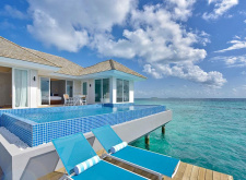 30 вилл,водные виллы с прямым спуском в воду. Спальня с кроватью king-size, зона отдыха с диваном, гардеробная, ванная комната с ванной и душем, обеденная зона на открытом воздухе, терраса с шезлонгами.